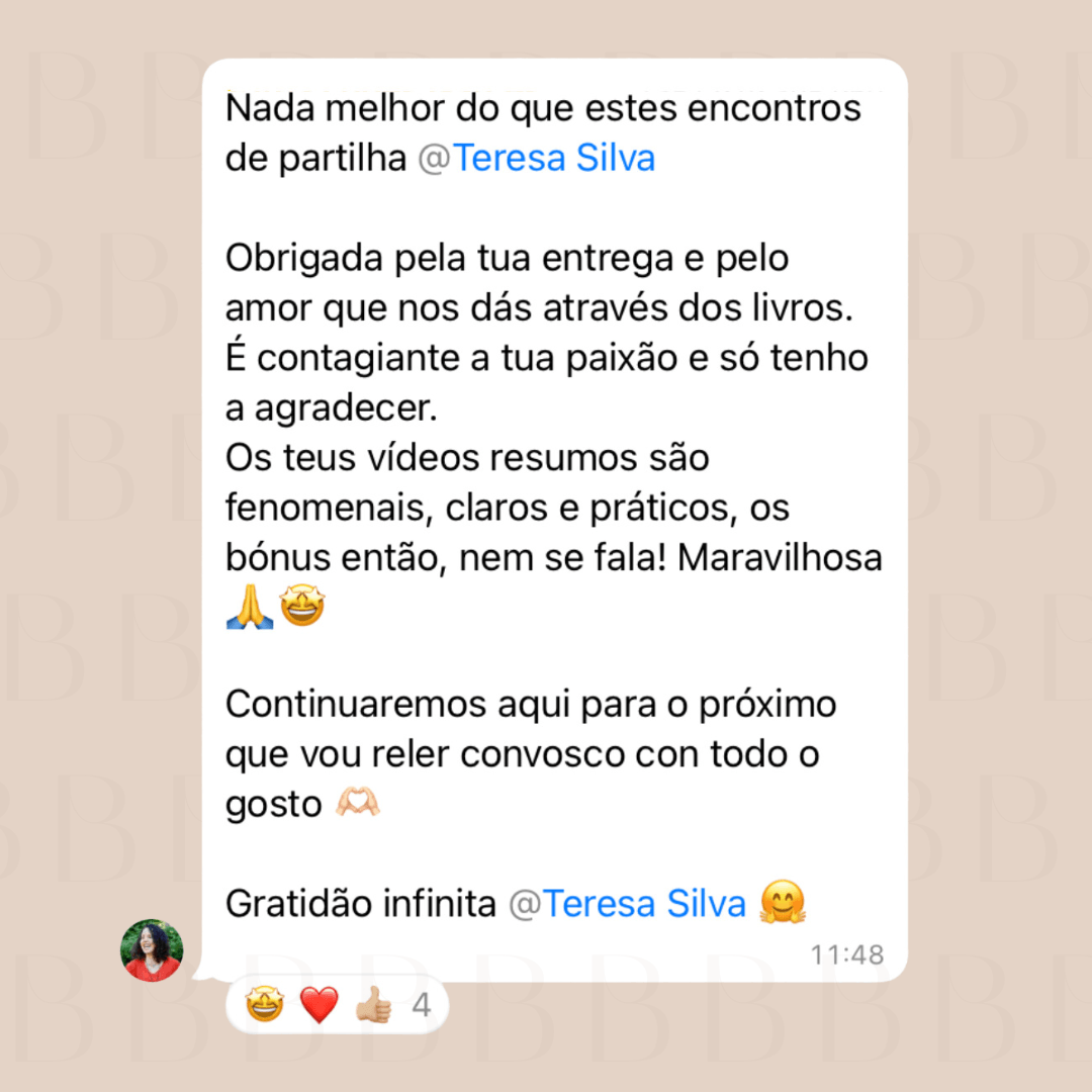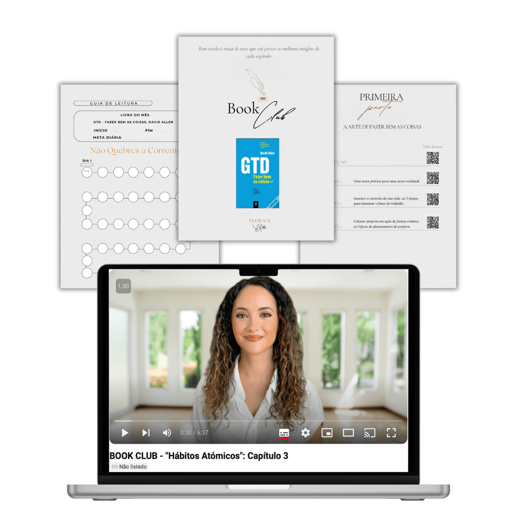 Lemos juntos 1 livro/mês com mentoria e acompanhamento-guiado de aulas-práticas, por capítulo. Cada livro será um curso imersivo e intensivo, onde aprofundamos os temas e transformamos os conhecimentos em estratégias práticas para aplicares na tua vida.