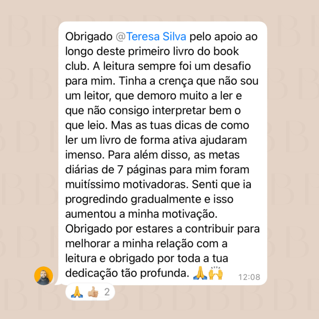 Não. Se preferires, podes simplesmente usufruir da Mentoria do Guia de Leitura, onde terás as aulas-práticas sobre cada capítulo, as reflexões e as maiores aprendizagens sobre o que o livro ensina. Embora recomendo sempre que faças a tua leitura individual do livro, ela é opcional. Podes fazer o curso sobre o livro e, em termos de aprendizagem e competências adquiridas, será iguala teres lido o livro naquele mês.